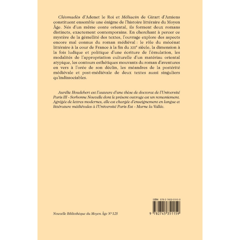 Cléomadès d’Adenet le Roi et Méliacin de Girart d’Amiens constituent ensemble une énigme de l’histoire littéraire du Moyen Âge. Nés d’un même conte oriental, ils forment deux romans distincts, exactement contemporains. En cherchant à percer ce mystère de la gémellité des textes, l’ouvrage explore des aspects encore mal connus du roman médiéval : le rôle du mécénat littéraire à la cour de France à la fin du XIIIe siècle, la dimension à la fois ludique et politique d’une écriture de l’émulation, les modalités de l’appropriation culturelle d’un matériau oriental atypique, les contours esthétiques mouvants du roman d’aventures en vers à l’orée de son déclin, les méandres de la postérité médiévale et post-médiévale de deux textes aussi singuliers qu’indissociables.