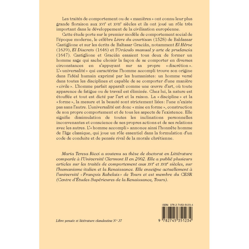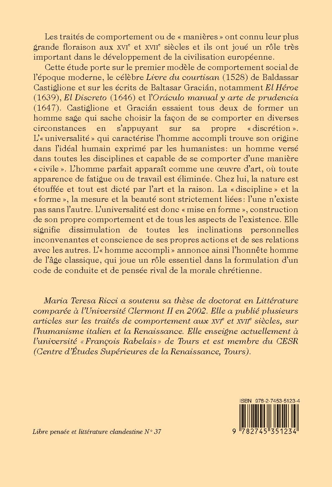 Cette étude porte sur le premier modèle de comportement social de l’époque moderne, le célèbre Livre du courtisan (1528) de Baldassar Castiglione et sur les écrits de Baltasar Gracián, notamment El Héroe (1639), El Discreto (1646) et l’Oráculo manual y arte de prudencia (1647). Castiglione et Gracián essaient tous deux de former un homme sage qui sache choisir la façon de se comporter en diverses circonstances en s’appuyant sur sa propre «discrétion». L’« universalité» qui caractérise l’homme accompli trouve son origine dans l’idéal humain exprimé par les humanistes: un homme versé dans toutes les disciplines et capable de se comporter d’une manière « civile ». L’homme parfait apparaît comme une oeuvre d’art, où toute apparence de fatigue ou de travail est éliminée. Chez lui, la nature est étouffée et tout est dicté par l’art et la raison. La « discipline » et la « forme », la mesure et la beauté sont strictement liées: l’une n’existe pas sans l’autre. L’universalité est donc « mise en forme », construction de son propre comportement et de tous les aspects de l’existence. Elle signifie dissimulation de toutes les inclinations personnelles inconvenantes et conscience de ses propres actions et de ses relations avec les autres. L’« homme accompli » annonce ainsi l’honnête homme de l’âge classique, qui joue un rôle essentiel dans la formulation d’un code de conduite et de pensée rival de la morale chrétienne.