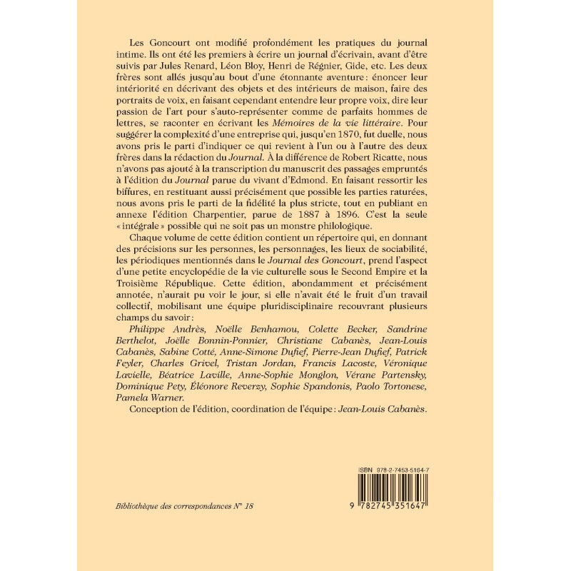 Chaque volume de cette édition contient un répertoire qui, en donnant des précisions sur les personnes, les personnages, les lieux de sociabilité, les périodiques mentionnés dans le Journal des Goncourt, prend l’aspect d’une petite encyclopédie de la vie culturelle sous le Second Empire et la Troisième République. Cette édition, abondamment et précisément annotée, n’aurait pu voir le jour, si elle n’avait été le fruit d’un travail collectif, mobilisant une équipe pluridisciplinaire recouvrant plusieurs champs du savoir :