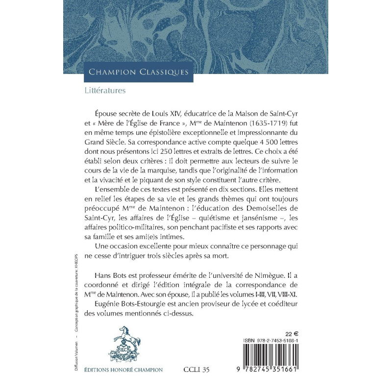Hans Bots est professeur émérite de l’université de Nimègue. Il a coordonné et dirigé l’édition intégrale de la correspondance de Mme de Maintenon. Avec son épouse, il a publié les volumes I-III, VII, VIII-XI. E