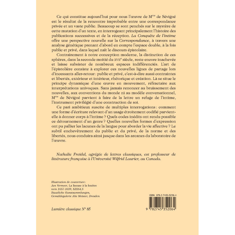 Ce qui constitue aujourd’hui pour nous l’oeuvre de Mme de Sévigné est le résultat de la rencontre improbable entre une correspondance privée et un vaste public. Beaucoup se sont penchés sur le mystère de cette mutation d’un texte, en interrogeant principalement l’histoire des publications successives et de la réception. La Conquête de l’intime offre une perspective nouvelle sur la Correspondance, à travers une analyse génétique prenant d’abord en compte l’espace double, à la fois public et privé, dans lequel naît le discours épistolaire.