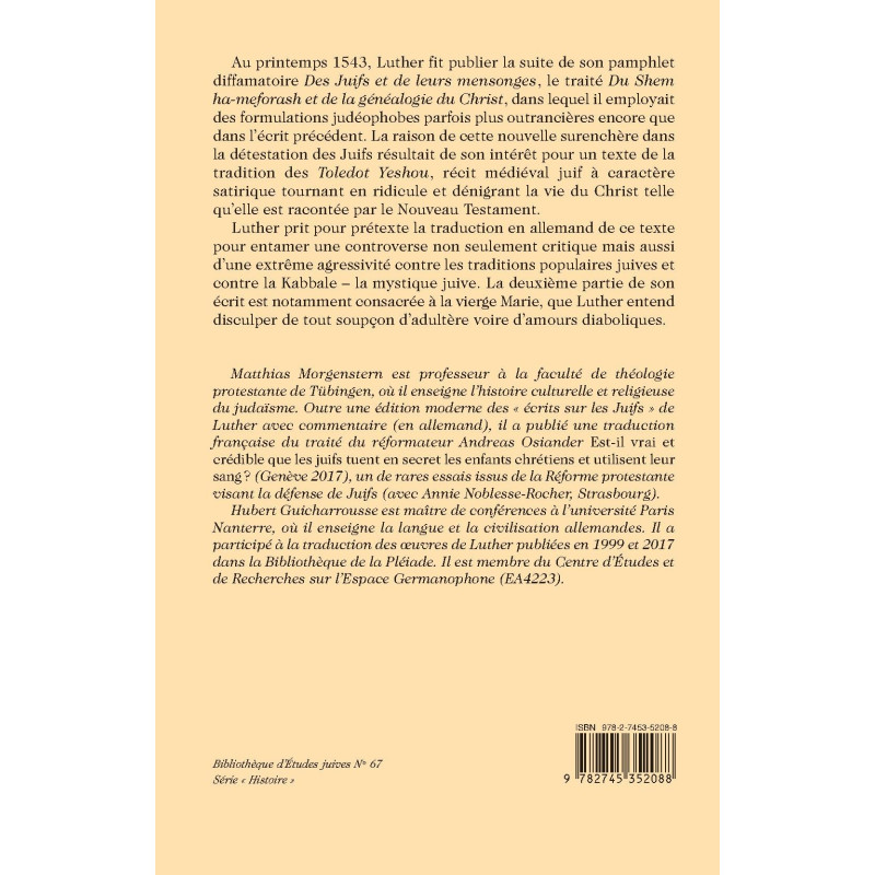 Au printemps 1543, Luther fit publier la suite de son pamphlet diffamatoire Des Juifs et de leurs mensonges, le traité Du Shem ha-meforash et de la généalogie du Christ, dans lequel il employait des formulations judéophobes parfois plus outrancières encore que dans l’écrit précédent. La raison de cette nouvelle surenchère dans la détestation des Juifs résultait de son intérêt pour un texte de la tradition des Toledot Yeshou, récit médiéval juif à caractère satirique tournant en ridicule et dénigrant la vie du Christ telle qu’elle est racontée par le Nouveau Testament.