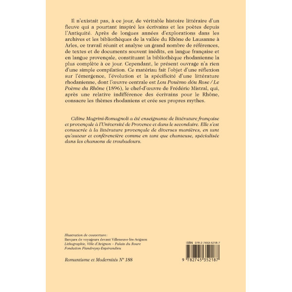 Il n’existait pas, à ce jour, de véritable histoire littéraire d’un fleuve qui a pourtant inspiré les écrivains et les poètes depuis l’Antiquité. Après de longues années d’explorations dans les archives et les bibliothèques de la vallée du Rhône de Lausanne à Arles, ce travail réunit et analyse un grand nombre de références, de textes et de documents souvent inédits, en langue française et en langue provençale, constituant la bibliothèque rhodanienne la plus complète à ce jour. Cependant, le présent ouvrage n’a rien d’une simple compilation. Ce matériau fait l’objet d’une réflexion sur l’émergence, l’évolution et la spécificité d’une littérature rhodanienne, dont l’oeuvre centrale est Lou Pouèmo dóu Rose / Le Poème du Rhône (1896), le chef-d’œuvre de Frédéric Mistral, qui, après une relative indifférence des écrivains pour le Rhône, consacre les thèmes rhodaniens et crée ses propres mythes.