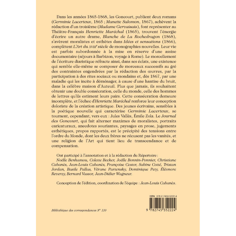 Dans les années 1865-1868, les Goncourt, publient deux romans (Germinie Lacerteux, 1865 ; Manette Salomon, 1867), achèvent la rédaction d’un troisième (Madame Gervaisais), font représenter au Théâtre-Français Henriette Maréchal (1865), trouvent l’énergie d’écrire un autre drame, Blanche de La Rochedragon (1868), s’avèrent moralistes et esthètes dans Idées et sensations (1866), complètent L’Art du XVIIIe siècle de monographies nouvelles. Leur vie est parfois subordonnée à la mise en réserve d’une assise documentaire (séjours à Barbizon, voyage à Rome). Le morcellement de l’écriture diaristique réfracte ainsi, dans ses éclats, une existence qui semble elle-même se composer de morceaux successifs au gré des contraintes engendrées par la rédaction des œuvres, par la participation à des rites sociaux ou mondains et, dès 1867, par une maladie qui les incite à déménager, à cause d’une hantise du bruit, dans la célèbre maison d’Auteuil. Plus que jamais, ils souhaitent obtenir une double consécration, celle du monde, celle des hommes de lettres qu’ils estiment leurs pairs. Cette consécration demeure incomplète, et l’échec d’Henriette Maréchal renforce leur conception doloriste de la création artistique. Des jeunes écrivains, sensibles à la poétique nouvelle qui caractérise Germinie Lacerteux, se tournent, cependant, vers eux : Jules Vallès, Émile Zola. Le Journal des Goncourt, qui fait alterner maximes de moralistes, portraits caricaturaux, anecdotes souriantes, paysages en prose, jugements esthétiques, propos rapportés, est le précipité des tensions entre l’ordre du Monde, dont les deux frères ne récusent pas les vanités, et une religion de l’Art qui tient lieu de transcendance et de compensation.