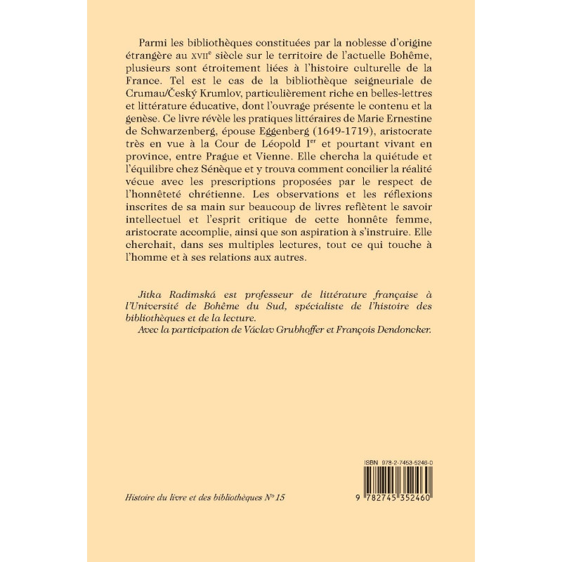 Parmi les bibliothèques constituées par la noblesse d’origine étrangère au XVIIe siècle sur le territoire de l’actuelle Bohême, plusieurs sont étroitement liées à l’histoire culturelle de la France. Tel est le cas de la bibliothèque seigneuriale de Crumau/ÄŒeský Krumlov, particulièrement riche en belles-lettres et littérature éducative, dont l’ouvrage présente le contenu et la genèse. Ce livre révèle les pratiques littéraires de Marie Ernestine de Schwarzenberg, épouse Eggenberg (1649-1719), aristocrate très en vue à la Cour de Léopold Ier et pourtant vivant en province, entre Prague et Vienne. Elle chercha la quiétude et l’équilibre chez Sénèque et y trouva comment concilier la réalité vécue avec les prescriptions proposées par le respect de l’honnêteté chrétienne. Les observations et les réflexions inscrites de sa main sur beaucoup de livres reflètent le savoir intellectuel et l’esprit critique de cette honnête femme, aristocrate accomplie, ainsi que son aspiration à s’instruire. Elle cherchait, dans ses multiples lectures, tout ce qui touche à l’homme et à ses relations aux autres.