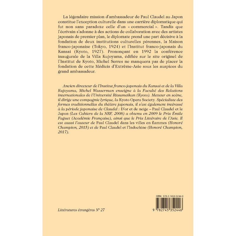 Ancien directeur de l’Institut franco-japonais du Kansai et de la Villa Kujoyama, Michel Wasserman enseigne à la Faculté des Relations internationales de l’Université Ritsumeikan (Kyoto). Metteur en scène, il dirige une compagnie lyrique, la Kyoto Opera Society. Spécialiste des formes traditionnelles du théâtre japonais, il s’est également intéressé à la période japonaise de Claudel : D’or et de neige – Paul Claudel et le Japon (Les Cahiers de la NRF, 2008) a obtenu en 2009 le Prix Émile Faguet (Académie Française), ainsi que le Prix Littéraire de l’Asie. Il est aussi l’auteur de Paul Claudel dans les villes en flammes (Honoré Champion, 2015) et de Paul Claudel et l’Indochine (Honoré Champion, 2017).