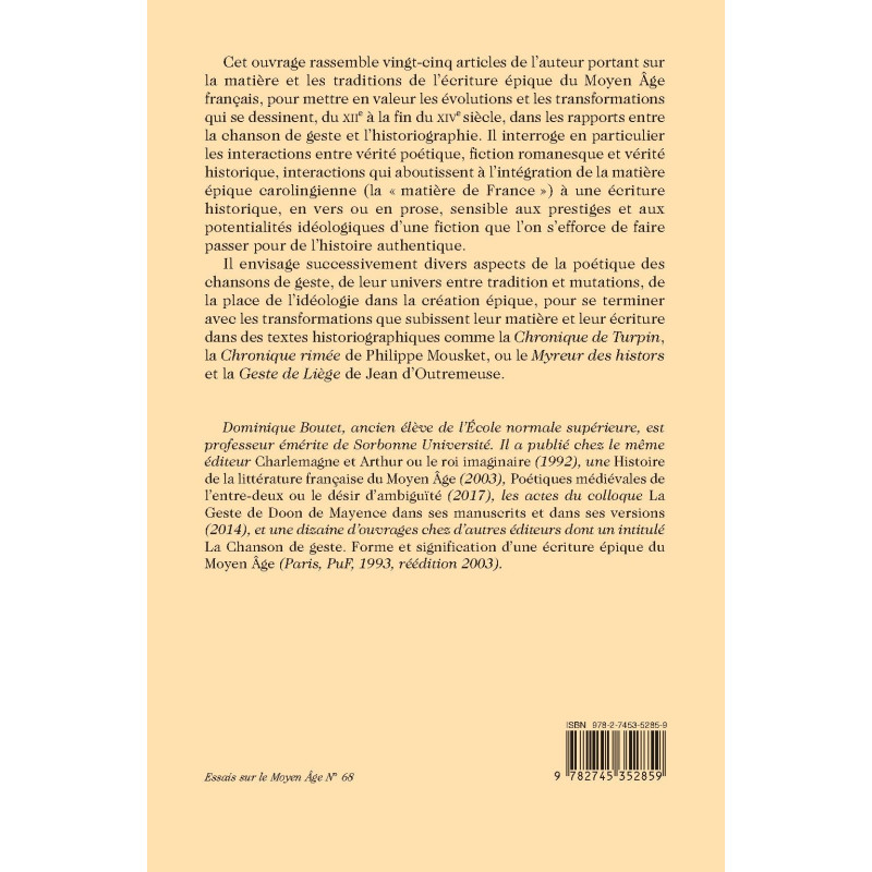 Dominique Boutet, ancien élève de l’École normale supérieure, est professeur émérite de Sorbonne Université. Il a publié chez le même éditeur Charlemagne et Arthur ou le roi imaginaire (1992), une Histoire de la littérature française du Moyen Âge (2003), Poétiques médiévales de l’entre-deux ou le désir d’ambiguïté (2017), les actes du colloque La Geste de Doon de Mayence dans ses manuscrits et dans ses versions (2014), et une dizaine d’ouvrages chez d’autres éditeurs dont un intitulé La Chanson de geste. Forme et signification d’une écriture épique du Moyen Âge (Paris, PuF, 1993, réédition 2003).