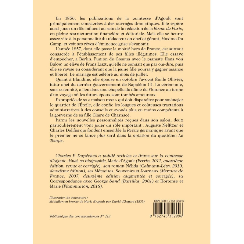 Charles F. Dupêchez a publié articles et livres sur la comtesse d’Agoult. Ainsi, sa biographie, Marie d’Agoult (Perrin, 2011, quatrième édition, revue et corrigée), son roman Nélida (Calmann-Lévy, 2010, deuxième édition), ses Mémoires, Souvenirs et Journaux (Mercure de France, 2007, deuxième édition augmentée et corrigée), sa Correspondance avec George Sand (Bartillat, 2001) et Hortense et Marie (Flammarion, 2018).