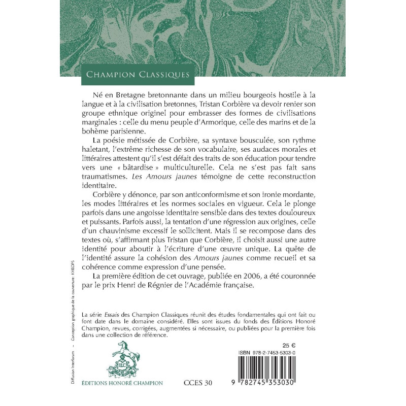 Corbière y dénonce, par son anticonformisme et son ironie mordante, les modes littéraires et les normes sociales en vigueur. Cela le plonge parfois dans une angoisse identitaire sensible dans des textes douloureux et puissants. Parfois aussi, la tentation d’une régression aux origines, celle d’un chauvinisme excessif le sollicitent. Mais il se recompose dans des textes où, s’affirmant plus Tristan que Corbière, il choisit aussi une autre identité pour aboutir à l’écriture d’une oeuvre unique. La quête de l’identité assure la cohésion des Amours jaunes comme recueil et sa cohérence comme expression d’une pensée.