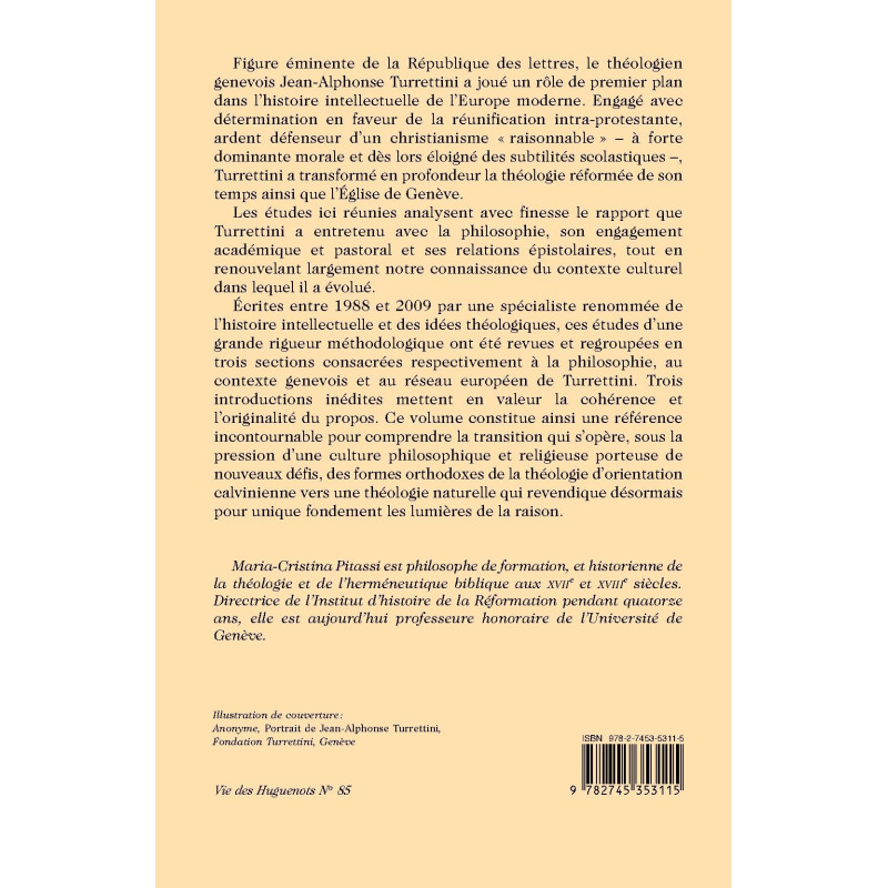 Figure éminente de la République des lettres, le théologien genevois Jean-Alphonse Turrettini a joué un rôle de premier plan dans l’histoire intellectuelle de l’Europe moderne. Engagé avec détermination en faveur de la réunification intra-protestante, ardent défenseur d’un christianisme « raisonnable » – à forte dominante morale et dès lors éloigné des subtilités scolastiques –, Turrettini a transformé en profondeur la théologie réformée de son temps ainsi que l’Église de Genève.