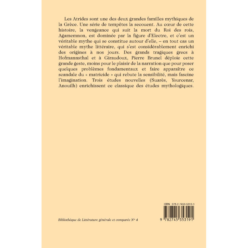 Les Atrides sont une des deux grandes familles mythiques de la Grèce. Une série de tempêtes la secouent. Au cœur de cette histoire, la vengeance qui suit la mort du Roi des rois, Agamemnon, est dominée par la figure d’Electre, et c’est un véritable mythe qui se constitue autour d’elle, – en tout cas un véritable mythe littéraire, qui s’est considérablement enrichi des origines à nos jours. Des grands tragiques grecs à Hofmannsthal et à Giraudoux, Pierre Brunel déploie cette grande geste, moins pour le plaisir de la narration que pour poser quelques problèmes fondamentaux et faire apparaître ce scandale du « matricide » qui rebute la sensibilité, mais fascine l’imagination. Trois études nouvelles (Suarès, Yourcenar, Anouilh) enrichissent ce classique des études mythologiques.