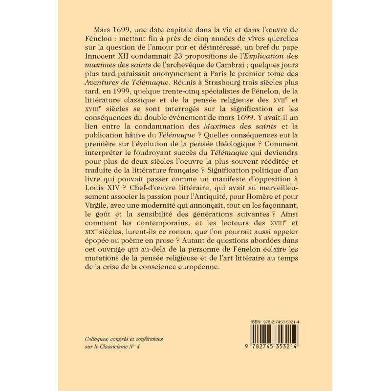 Mars 1699, une date capitale dans la vie et dans l’oeuvre de Fénelon : mettant fin à près de cinq années de vives querelles sur la question de l’amour pur et désintéressé, un bref du pape Innocent XII condamnait 23 propositions de l’Explication des maximes des saints de l’archevêque de Cambrai ; quelques jours plus tard paraissait anonymement à Paris le premier tome des Aventures de Télémaque. Réunis à Strasbourg trois siècles plus tard, en 1999, quelque trente-cinq spécialistes de Fénelon, de la littérature classique et de la pensée religieuse des XVIIe et XVIIIe siècles se sont interrogés sur la signification et les conséquences du double événement de mars 1699. Y avait-il un lien entre la condamnation des Maximes des saints et la publication hâtive du Télémaque ? Quelles conséquences eut la première sur l’évolution de la pensée théologique ? Comment interpréter le foudroyant succès du Télémaque qui deviendra pour plus de deux siècles l’oeuvre la plus souvent rééditée et traduite de la littérature française ? Signification politique d’un livre qui pouvait passer comme un manifeste d’opposition à Louis XIV ? Chef-d’œuvre littéraire, qui avait su merveilleusement associer la passion pour l’Antiquité, pour Homère et pour Virgile, avec une modernité qui annonçait, tout en les façonnant, le goût et la sensibilité des générations suivantes ? Ainsi comment les contemporains, et les lecteurs des XVIIIe et XIXe siècles, lurent-ils ce roman, que l’on pourrait aussi appeler épopée ou poème en prose ? Autant de questions abordées dans cet ouvrage qui au-delà de la personne de Fénelon éclaire les mutations de la pensée religieuse et de l’art littéraire au temps de la crise de la conscience européenne.