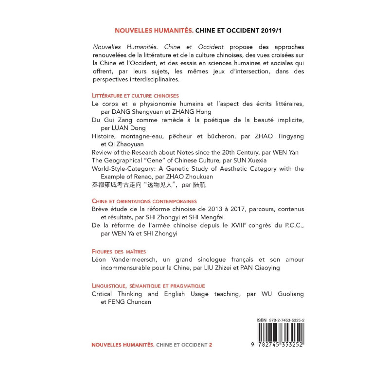 Nouvelles Humanités. Chine et Occident propose des approches renouvelées de la littérature et de la culture chinoises, des vues croisées sur la Chine et l’Occident, et des essais en sciences humaines et sociales qui offrent, par leurs sujets, les mêmes jeux d’intersection, dans des perspectives interdisciplinaires.