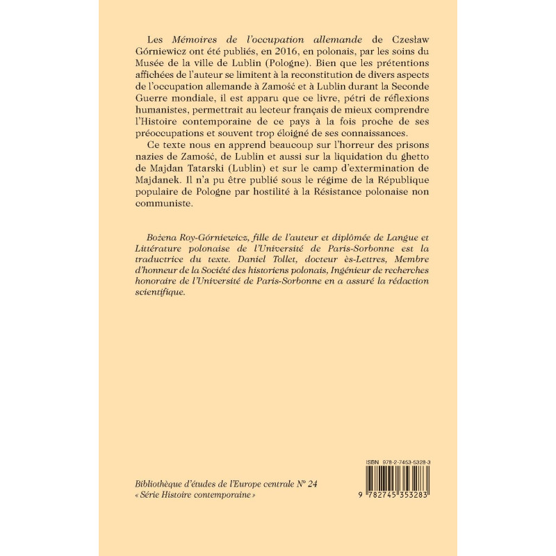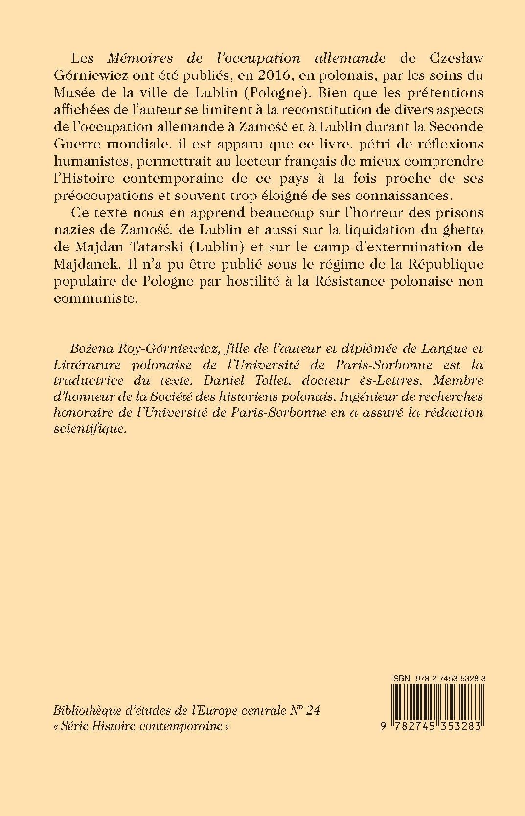 Les Mémoires de l’occupation allemande de CzesÅ‚aw Górniewicz ont été publiés, en 2016, en polonais, par les soins du Musée de la ville de Lublin (Pologne). Bien que les prétentions affichées de l’auteur se limitent à la reconstitution de divers aspects de l’occupation allemande à Zamość et à Lublin durant la Seconde Guerre mondiale, il est apparu que ce livre, pétri de réflexions humanistes, permettrait au lecteur français de mieux comprendre l’Histoire contemporaine de ce pays à la fois proche de ses préoccupations et souvent trop éloigné de ses connaissances.