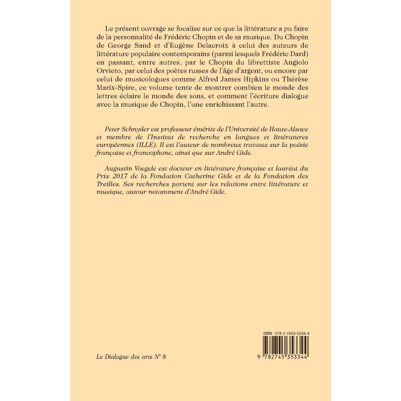 Le présent ouvrage se focalise sur ce que la littérature a pu faire de la personnalité de Frédéric Chopin et de sa musique. Du Chopin de George Sand et d’Eugène Delacroix à celui des auteurs de littérature populaire contemporains (parmi lesquels Frédéric Dard) en passant, entre autres, par le Chopin du librettiste Angiolo Orvieto, par celui des poètes russes de l’âge d’argent, ou encore par celui de musicologues comme Alfred James Hipkins ou Thérèse Marix-Spire, ce volume tente de montrer combien le monde des lettres éclaire le monde des sons, et comment l’écriture dialogue avec la musique de Chopin, l’une enrichissant l’autre.
