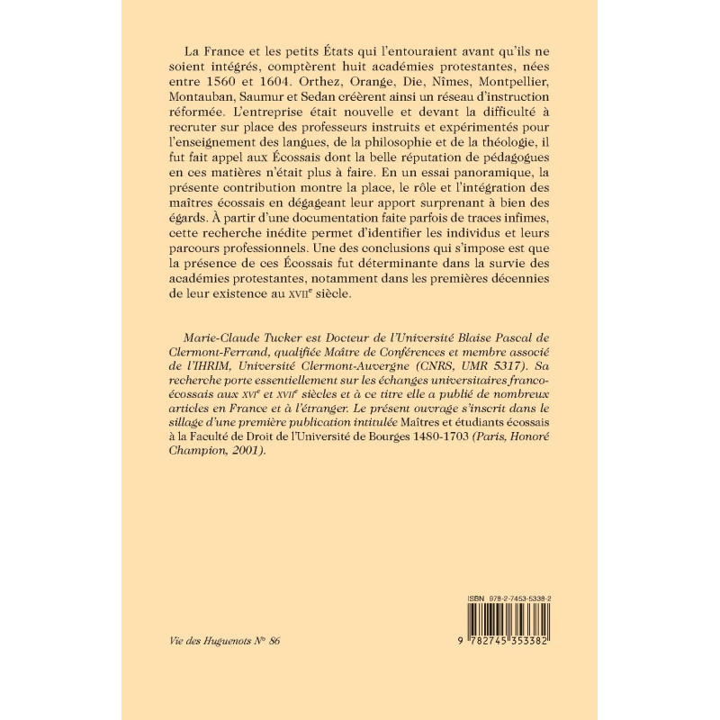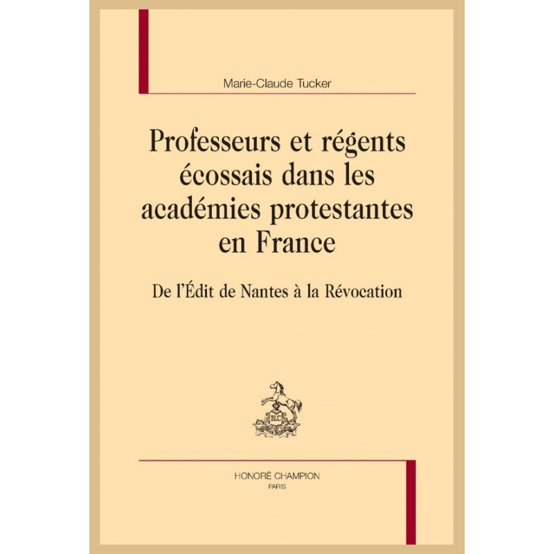 Marie-Claude Tucker est Docteur de l’Université Blaise Pascal de Clermont-Ferrand, qualifiée Maître de Conférences et membre associé de l’IHRIM, Université Clermont-Auvergne (CNRS, UMR 5317). Sa recherche porte essentiellement sur les échanges universitaires franco-écossais aux XVIe et XVIIe siècles et à ce titre elle a publié de nombreux articles en France et à l’étranger. Le présent ouvrage s’inscrit dans le sillage d’une première publication intitulée Maîtres et étudiants écossais à la Faculté de Droit de l’Université de Bourges 1480-1703 (Paris, Honoré Champion, 2001).