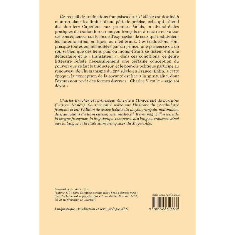 Ce recueil de traductions françaises du XIVe siècle est destiné à montrer, dans les limites d’une période précise, celle qui s’étend des derniers Capétiens aux premiers Valois, la diversité des pratiques de traduction en moyen français et à mettre en valeur ses conséquences sur le mode d’expression de ceux qui traduisaient les auteurs latins, antiques ou médiévaux. Ces traductions sont presque toutes commanditées par un prince, une princesse ou un roi, si bien que des liens plus ou moins étroits se tissent entre le dédicataire et le « translateur » ; dans ces conditions, ce genre littéraire reflète nécessairement une certaine conception du pouvoir que se fait le traducteur, et le pouvoir politique participe au renouveau de l’humanisme du XIVe siècle en France. Enfin, à cette époque, la conception de la royauté est liée à la spiritualité, dont l’expression revêt des formes diverses : Charles V est le « sage roi dévot ».