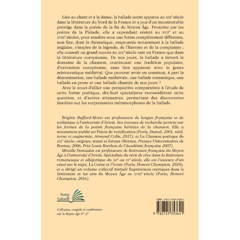 Liée au chant et à la danse, la ballade serait apparue au XIIIe siècle dans la littérature du Nord de la France et a joui d’un incontestable prestige dans la poésie de la fin du Moyen Âge. Proscrite par les poètes de la Pléiade, elle a cependant résisté au XVIIe et au XVIIIe siècles, pour renaître sous une forme complètement différente, non fixe, dont la thématique, empruntée notamment à la ballade anglaise, s’inspire de la légende, de l’histoire et de la complainte ; elle connaît un grand succès au XIXe siècle tant en France que dans la littérature européenne. De nos jours, la ballade a investi le domaine de la chanson, continuant une tradition populaire, d’extension européenne, sans lien apparent avec le genre aristocratique médiéval. Que peuvent avoir en commun, à part la dénomination, une ballade médiévale, une ballade romantique, une ballade en prose et une ballade chantée de nos jours ?