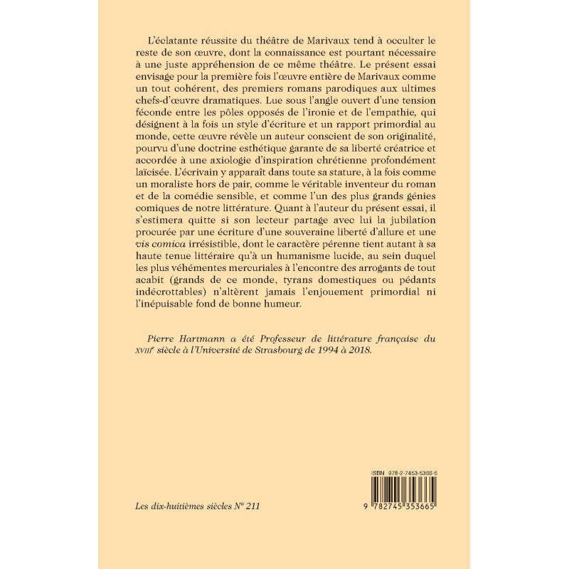 L’éclatante réussite du théâtre de Marivaux tend à occulter le reste de son œuvre, dont la connaissance est pourtant nécessaire à une juste appréhension de ce même théâtre. Le présent essai envisage pour la première fois l’œuvre entière de Marivaux comme un tout cohérent, des premiers romans parodiques aux ultimes chefs-d’œuvre dramatiques. Lue sous l’angle ouvert d’une tension féconde entre les pôles opposés de l’ironie et de l’empathie, qui désignent à la fois un style d’écriture et un rapport primordial au monde, cette oeuvre révèle un auteur conscient de son originalité, pourvu d’une doctrine esthétique garante de sa liberté créatrice et accordée à une axiologie d’inspiration chrétienne profondément laïcisée. L’écrivain y apparaît dans toute sa stature, à la fois comme un moraliste hors de pair, comme le véritable inventeur du roman et de la comédie sensible, et comme l’un des plus grands génies comiques de notre littérature. Quant à l’auteur du présent essai, il s’estimera quitte si son lecteur partage avec lui la jubilation procurée par une écriture d’une souveraine liberté d’allure et une vis comica irrésistible, dont le caractère pérenne tient autant à sa haute tenue littéraire qu’à un humanisme lucide, au sein duquel les plus véhémentes mercuriales à l’encontre des arrogants de tout acabit (grands de ce monde, tyrans domestiques ou pédants indécrottables) n’altèrent jamais l’enjouement primordial ni l’inépuisable fond de bonne humeur.