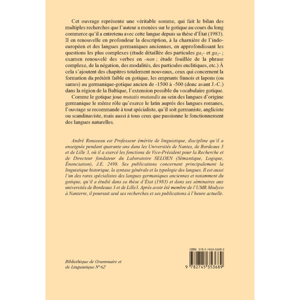 Cet ouvrage représente une véritable somme, qui fait le bilan des multiples recherches que l’auteur a menées sur le gotique au cours du long commerce qu’il a entretenu avec cette langue depuis sa thèse d’État (1983). Il en renouvelle en profondeur la description, à la charnière de l’indoeuropéen et des langues germaniques anciennes, en approfondissant les questions les plus complexes (étude détaillée des particules ga1- et ga2- ; examen renouvelé des verbes en -nan ; étude fouillée de la phrase complexe, de la négation, des modalités, des particules enclitiques, etc.) À cela s’ajoutent des chapitres totalement nouveaux, ceux qui concernent la formation du prétérit faible en gotique, les emprunts finnois et lapons (ou sames) au germanique-gotique ancien de 1500 à 500 (donc avant J.C.) dans la région de la Baltique, l’extension possible du vocabulaire gotique.