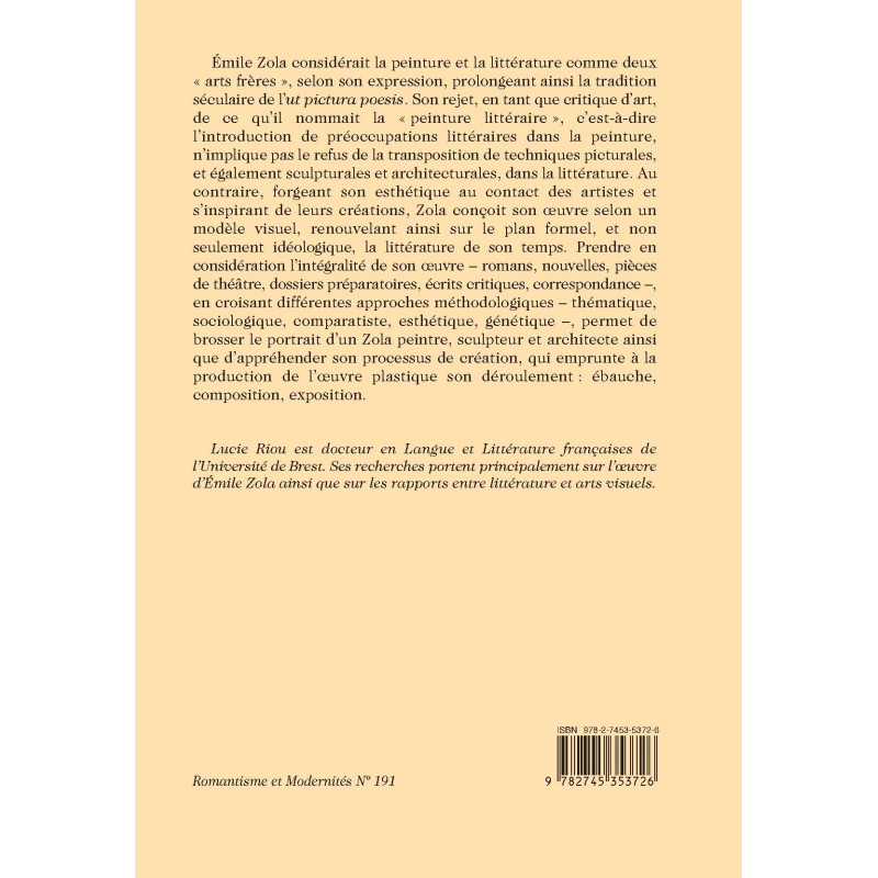 Émile Zola considérait la peinture et la littérature comme deux « arts frères », selon son expression, prolongeant ainsi la tradition séculaire de l’ut pictura poesis. Son rejet, en tant que critique d’art, de ce qu’il nommait la « peinture littéraire », c’est-à-dire l’introduction de préoccupations littéraires dans la peinture, n’implique pas le refus de la transposition de techniques picturales, et également sculpturales et architecturales, dans la littérature. Au contraire, forgeant son esthétique au contact des artistes et s’inspirant de leurs créations, Zola conçoit son oeuvre selon un modèle visuel, renouvelant ainsi sur le plan formel, et non seulement idéologique, la littérature de son temps. Prendre en considération l’intégralité de son œuvre – romans, nouvelles, pièces de théâtre, dossiers préparatoires, écrits critiques, correspondance –, en croisant différentes approches méthodologiques – thématique, sociologique, comparatiste, esthétique, génétique –, permet de brosser le portrait d’un Zola peintre, sculpteur et architecte ainsi que d’appréhender son processus de création, qui emprunte à la production de l’œuvre plastique son déroulement : ébauche, composition, exposition.