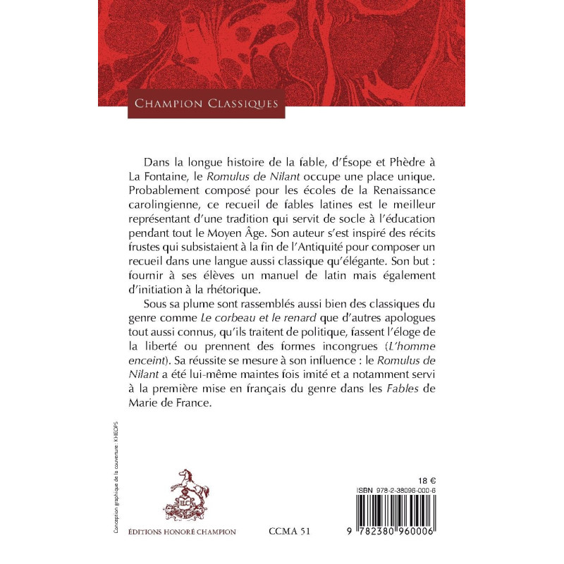 Dans la longue histoire de la fable, d’Ésope et Phèdre à La Fontaine, le Romulus de Nilant occupe une place unique. Probablement composé pour les écoles de la Renaissance carolingienne, ce recueil de fables latines est le meilleur représentant d’une tradition qui servit de socle à l’éducation pendant tout le Moyen Âge. Son auteur s’est inspiré des récits frustes qui subsistaient à la fin de l’Antiquité pour composer un recueil dans une langue aussi classique qu’élégante. Son but : fournir à ses élèves un manuel de latin mais également d’initiation à la rhétorique.