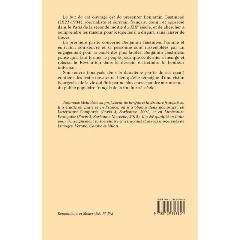 Le but de cet ouvrage est de présenter Benjamin Gastineau (1823-1904), journaliste et écrivain français, connu et apprécié dans le Paris de la seconde moitié du XIXe siècle, et de chercher à comprendre les raisons pour lesquelles il a disparu sans laisser de traces.