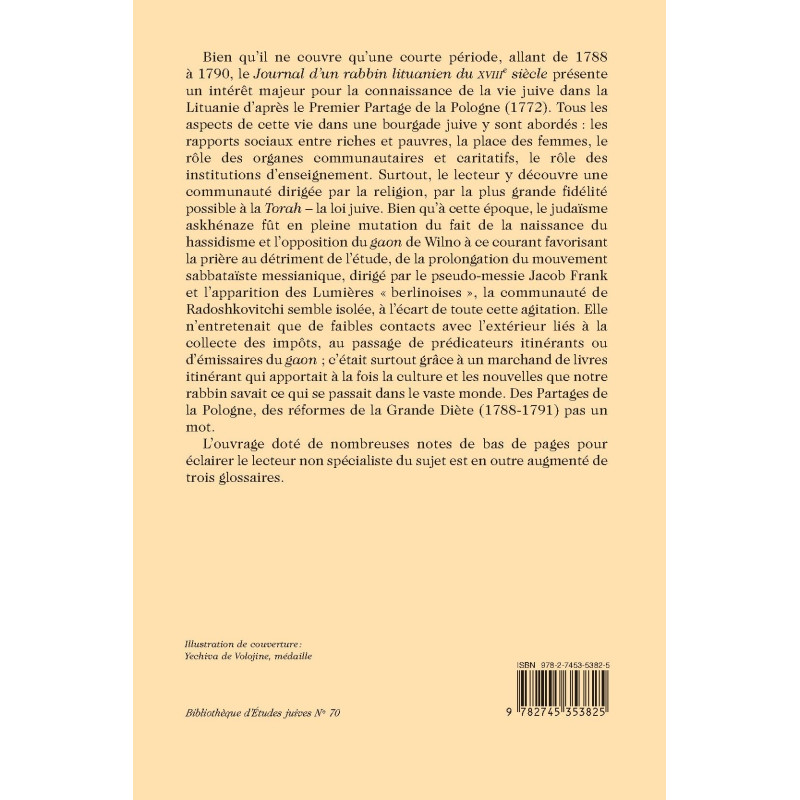 Bien qu’il ne couvre qu’une courte période, allant de 1788 à 1790, le Journal d’un rabbin lituanien du XVIIIe siècle présente un intérêt majeur pour la connaissance de la vie juive dans la Lituanie d’après le Premier Partage de la Pologne (1772). Tous les aspects de cette vie dans une bourgade juive y sont abordés : les rapports sociaux entre riches et pauvres, la place des femmes, le rôle des organes communautaires et caritatifs, le rôle des institutions d’enseignement. Surtout, le lecteur y découvre une communauté dirigée par la religion, par la plus grande fidélité possible à la Torah – la loi juive. Bien qu’à cette époque, le judaïsme askhénaze fût en pleine mutation du fait de la naissance du hassidisme et l’opposition du gaon de Wilno à ce courant favorisant la prière au détriment de l’étude, de la prolongation du mouvement sabbataïste messianique, dirigé par le pseudo-messie Jacob Frank et l’apparition des Lumières « berlinoises », la communauté de Radoshkovitchi semble isolée, à l’écart de toute cette agitation. Elle n’entretenait que de faibles contacts avec l’extérieur liés à la collecte des impôts, au passage de prédicateurs itinérants ou d’émissaires du gaon ; c’était surtout grâce à un marchand de livres itinérant qui apportait à la fois la culture et les nouvelles que notre rabbin savait ce qui se passait dans le vaste monde. Des Partages de la Pologne, des réformes de la Grande Diète (1788-1791) pas un mot.