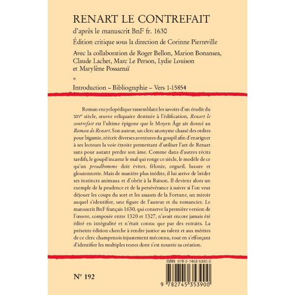 Roman encyclopédique rassemblant les savoirs d’un érudit du XIVe siècle, oeuvre reliquaire destinée à l’édification, Renart le contrefait est l’ultime épigone que le Moyen Âge ait donné au Roman de Renart. Son auteur, un clerc anonyme chassé des ordres pour bigamie, réécrit diverses aventures du goupil afin d’enseigner à ses lecteurs la voie étroite permettant d’utiliser l’art de Renart sans pour autant perdre son âme. Comme dans d’autres récits tardifs, le goupil incarne le mal qui ronge ce siècle, le modèle de ce qu’un preudhomme doit éviter, félonie, orgueil, luxure et gloutonnerie. Mais de manière plus inédite, il lui arrive de brider ses instincts animaux et d’obéir à la Raison. Il devient alors un exemple de la prudence et de la persévérance à suivre si l’on veut déjouer les coups du sort et les assauts de la Fortune, un miroir auquel s’identifier, une figure de l’auteur et du romancier. Le manuscrit BnF français 1630, qui conserve la première version de l’oeuvre, composée entre 1320 et 1327, n’avait encore jamais été édité en intégralité et n’était connu que par des extraits. La présente édition cherche à rendre justice au talent et aux mérites de ce clerc champenois injustement méconnu, tout en s’efforçant d’identifier les multiples textes dont s’est nourrie sa création.