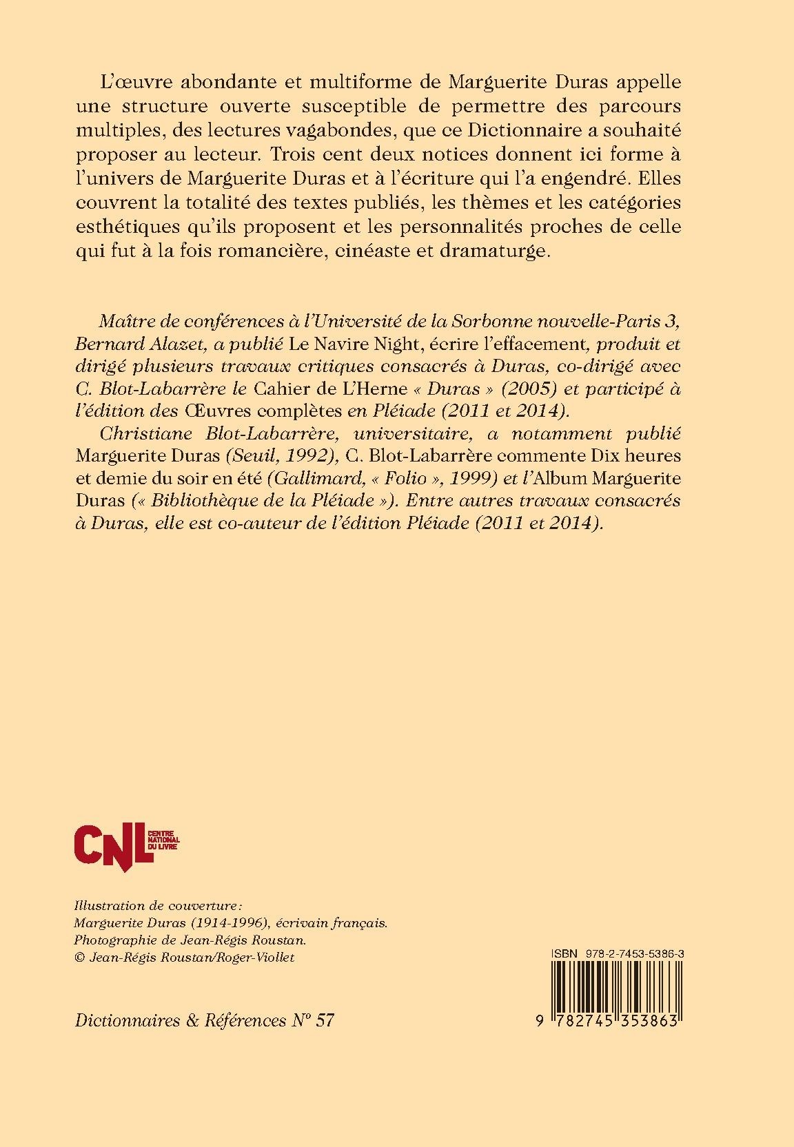 L’œuvre abondante et multiforme de Marguerite Duras appelle une structure ouverte susceptible de permettre des parcours multiples, des lectures vagabondes, que ce Dictionnaire a souhaité proposer au lecteur. Trois cent deux notices donnent ici forme à l’univers de Marguerite Duras et à l’écriture qui l’a engendré. Elles couvrent la totalité des textes publiés, les thèmes et les catégories esthétiques qu’ils proposent et les personnalités proches de celle qui fut à la fois romancière, cinéaste et dramaturge.