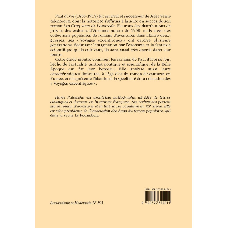 Paul d’Ivoi (1856-1915) fut un rival et successeur de Jules Verne talentueux, dont la notoriété s’affirma à la suite du succès de son roman Les Cinq sous de Lavarède. Fleurons des distributions de prix et des cadeaux d’étrennes autour de 1900, mais aussi des collections populaires de romans d’aventures dans l’Entre-deux-guerres, ses « Voyages excentriques » ont captivé plusieurs générations. Séduisant l’imagination par l’exotisme et la fantaisie scientifique qu’ils cultivent, ils sont aussi très ancrés dans leur temps.