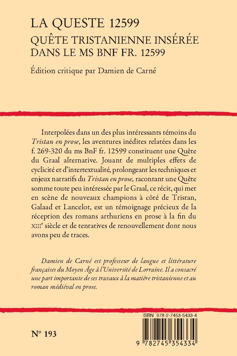 Damien de Carné est professeur de langue et littérature françaises du Moyen Âge à l’Université de Lorraine. Il a consacré une part importante de ses travaux à la matière tristanienne et au roman médiéval en prose.