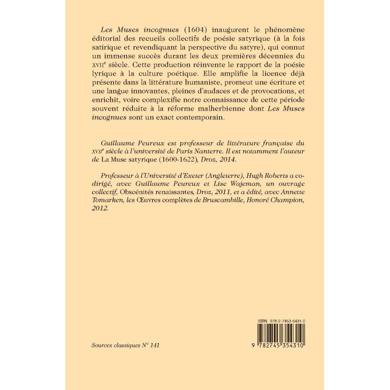 Les Muses incognues (1604) inaugurent le phénomène éditorial des recueils collectifs de poésie satyrique (à la fois satirique et revendiquant la perspective du satyre), qui connut un immense succès durant les deux premières décennies du XVIIe siècle. Cette production réinvente le rapport de la poésie lyrique à la culture poétique. Elle amplifie la licence déjà présente dans la littérature humaniste, promeut une écriture et une langue innovantes, pleines d’audaces et de provocations, et enrichit, voire complexifie notre connaissance de cette période souvent réduite à la réforme malherbienne dont Les Muses incognues sont un exact contemporain.