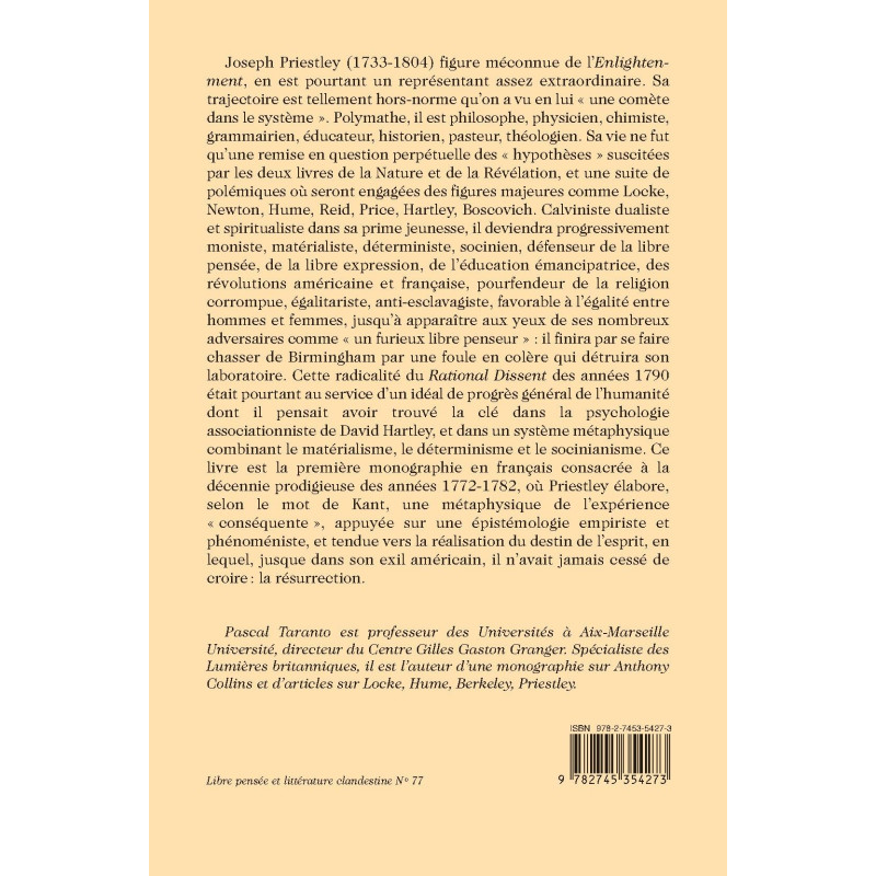 Joseph Priestley (1733-1804) figure méconnue de l’Enlightenment, en est pourtant un représentant assez extraordinaire. Sa trajectoire est tellement hors-norme qu’on a vu en lui « une comète dans le système ». Polymathe, il est philosophe, physicien, chimiste, grammairien, éducateur, historien, pasteur, théologien. Sa vie ne fut qu’une remise en question perpétuelle des « hypothèses » suscitées par les deux livres de la Nature et de la Révélation, et une suite de polémiques où seront engagées des figures majeures comme Locke, Newton, Hume, Reid, Price, Hartley, Boscovich. Calviniste dualiste et spiritualiste dans sa prime jeunesse, il deviendra progressivement moniste, matérialiste, déterministe, socinien, défenseur de la libre pensée, de la libre expression, de l’éducation émancipatrice, des révolutions américaine et française, pourfendeur de la religion corrompue, égalitariste, anti-esclavagiste, favorable à l’égalité entre hommes et femmes, jusqu’à apparaître aux yeux de ses nombreux adversaires comme « un furieux libre penseur » : il finira par se faire chasser de Birmingham par une foule en colère qui détruira son laboratoire. Cette radicalité du Rational Dissent des années 1790 était pourtant au service d’un idéal de progrès général de l’humanité dont il pensait avoir trouvé la clé dans la psychologie associationniste de David Hartley, et dans un système métaphysique combinant le matérialisme, le déterminisme et le socinianisme. Ce livre est la première monographie en français consacrée à la décennie prodigieuse des années 1772-1782, où Priestley élabore, selon le mot de Kant, une métaphysique de l’expérience « conséquente », appuyée sur une épistémologie empiriste et phénoméniste, et tendue vers la réalisation du destin de l’esprit, en lequel, jusque dans son exil américain, il n’avait jamais cessé de croire : la résurrection.