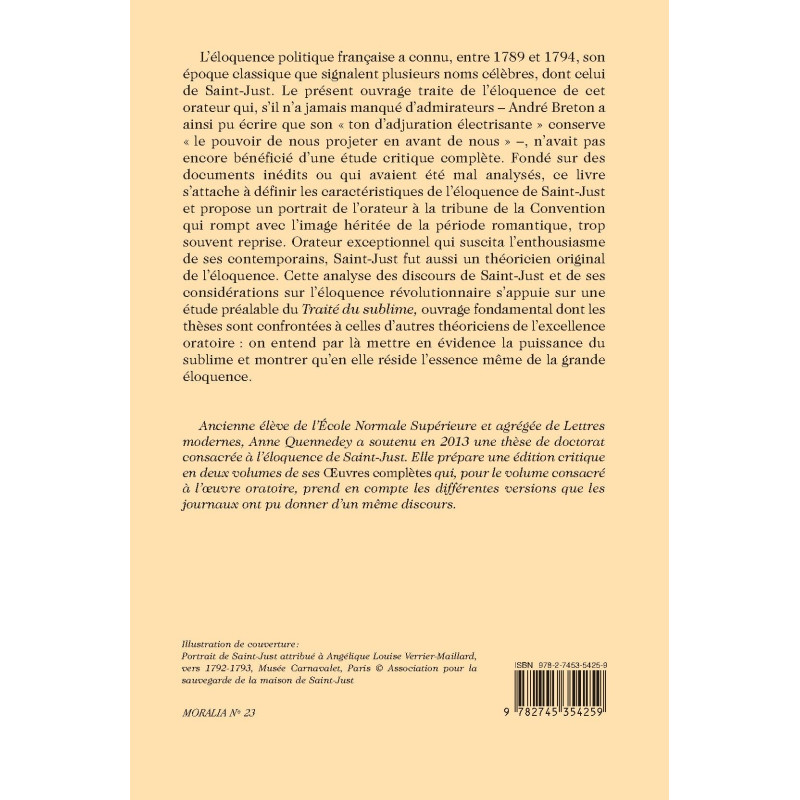 L’éloquence politique française a connu, entre 1789 et 1794, son époque classique que signalent plusieurs noms célèbres, dont celui de Saint-Just. Le présent ouvrage traite de l’éloquence de cet orateur qui, s’il n’a jamais manqué d’admirateurs – André Breton a ainsi pu écrire que son « ton d’adjuration électrisante » conserve « le pouvoir de nous projeter en avant de nous » –, n’avait pas encore bénéficié d’une étude critique complète. Fondé sur des documents inédits ou qui avaient été mal analysés, ce livre s’attache à définir les caractéristiques de l’éloquence de Saint-Just et propose un portrait de l’orateur à la tribune de la Convention qui rompt avec l’image héritée de la période romantique, trop souvent reprise. Orateur exceptionnel qui suscita l’enthousiasme de ses contemporains, Saint-Just fut aussi un théoricien original de l’éloquence. Cette analyse des discours de Saint-Just et de ses considérations sur l’éloquence révolutionnaire s’appuie sur une étude préalable du Traité du sublime, ouvrage fondamental dont les thèses sont confrontées à celles d’autres théoriciens de l’excellence oratoire : on entend par là mettre en évidence la puissance du sublime et montrer qu’en elle réside l’essence même de la grande éloquence.