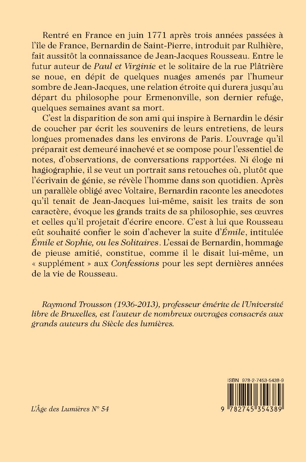 C’est la disparition de son ami qui inspire à Bernardin le désir de coucher par écrit les souvenirs de leurs entretiens, de leurs longues promenades dans les environs de Paris. L’ouvrage qu’il préparait est demeuré inachevé et se compose pour l’essentiel de notes, d’observations, de conversations rapportées. Ni éloge ni hagiographie, il se veut un portrait sans retouches où, plutôt que l’écrivain de génie, se révèle l’homme dans son quotidien. Après un parallèle obligé avec Voltaire, Bernardin raconte les anecdotes qu’il tenait de Jean-Jacques lui-même, saisit les traits de son caractère, évoque les grands traits de sa philosophie, ses œuvres et celles qu’il projetait d’écrire encore. C’est à lui que Rousseau eût souhaité confier le soin d’achever la suite d’Émile, intitulée Émile et Sophie, ou les Solitaires. L’essai de Bernardin, hommage de pieuse amitié, constitue, comme il le disait lui-même, un « supplément » aux Confessions pour les sept dernières années de la vie de Rousseau.