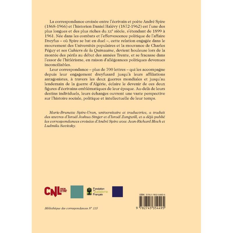 La correspondance croisée entre l’écrivain et poète André Spire (1868-1966) et l’historien Daniel Halévy (1872-1962) est l’une des plus longues et des plus riches du XXe siècle, s’étendant de 1899 à 1961. Née dans les combats et l’effervescence politique de l’affaire Dreyfus – où Spire se bat en duel –, cette relation engagée dans le mouvement des Universités populaires et la mouvance de Charles Péguy et ses Cahiers de la Quinzaine, devient houleuse lors de la montée des périls au début des années Trente, et se fracasse dans l’essor de l’hitlérisme, en raison d’allégeances politiques devenues inconciliables.