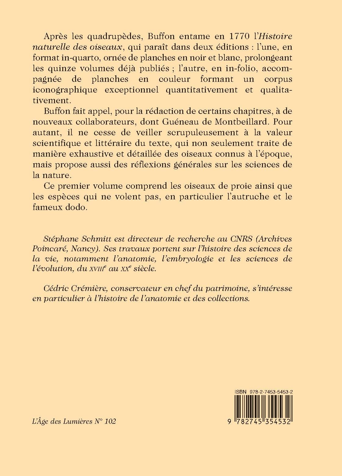 Après les quadrupèdes, Buffon entame en 1770 l’Histoire naturelle des oiseaux, qui paraît dans deux éditions : l’une, en format in-quarto, ornée de planches en noir et blanc, prolongeant les quinze volumes déjà publiés ; l’autre, en in-folio, accompagnée de planches en couleur formant un corpus iconographique exceptionnel quantitativement et qualitativement.