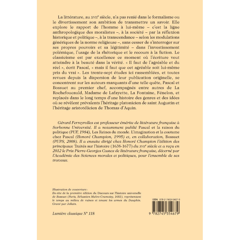 La littérature, au XVIIe siècle, n'a pas renié dans le formalisme ou le divertissement son ambition de transmettre un savoir. Elle explore le rapport de l’homme à lui-même – c’est la ligne anthropologique des moralistes –, à la société – par la réflexion historique et politique –, à la transcendance – selon les modulations génériques de la norme religieuse –, sans cesser de s’interroger sur ses propres pouvoirs et sa légitimité – dans l’investissement polémique, l’usage de la rhétorique et le recours à la fiction. Le classicisme est par excellence ce moment où l’écriture veut atteindre à la beauté dans la vérité. « Il faut de l’agréable et du réel », écrit Pascal, « mais il faut que cet agréable soit lui-même pris du vrai ». Les trente-sept études ici rassemblées, et toutes revues depuis la dispersion de leur publication originelle, se concentrent sur les auteurs marquants d’une telle quête, Pascal et Bossuet au premier chef, accompagnés entre autres de La Rochefoucauld, Madame de Lafayette, La Fontaine, Fénelon, et replacés dans le long temps d’une histoire des genres et des idées où se révèlent prévalents l’héritage platonicien de saint Augustin et l’héritage aristotélicien de Thomas d’Aquin.