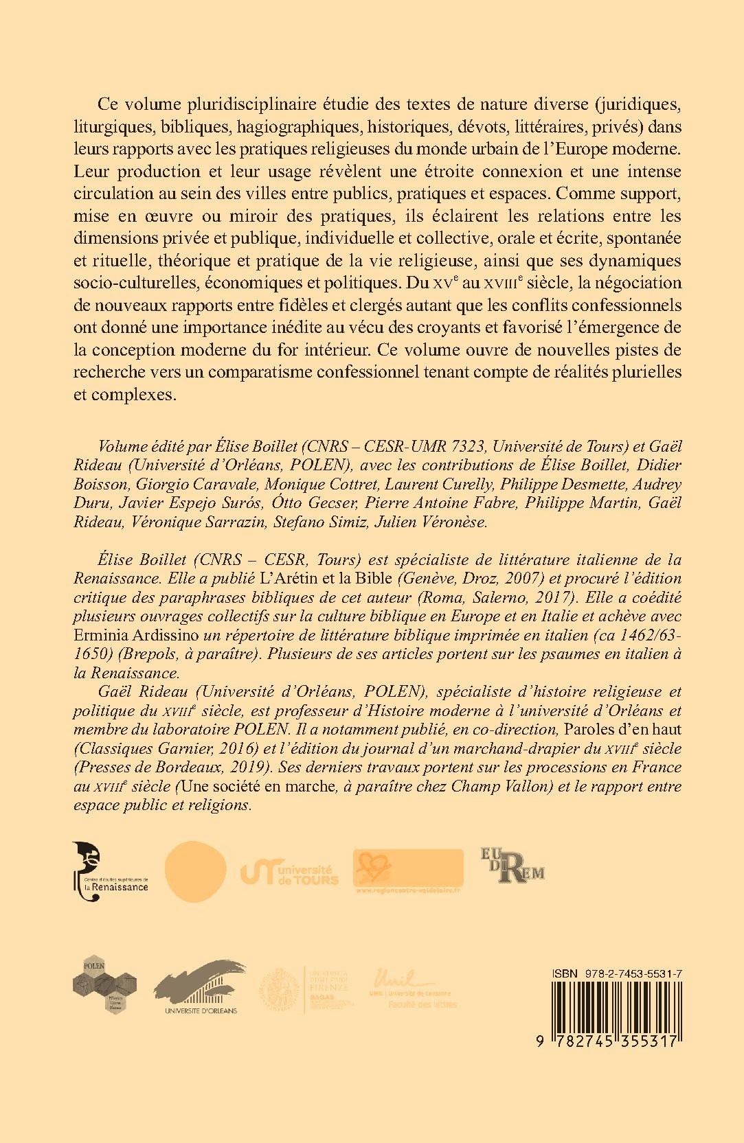 Ce volume pluridisciplinaire étudie des textes de nature diverse (juridiques, liturgiques, bibliques, hagiographiques, historiques, dévots, littéraires, privés) dans leurs rapports avec les pratiques religieuses du monde urbain de l’Europe moderne. Leur production et leur usage révèlent une étroite connexion et une intense circulation au sein des villes entre publics, pratiques et espaces. Comme support, mise en oeuvre ou miroir des pratiques, ils éclairent les relations entre les dimensions privée et publique, individuelle et collective, orale et écrite, spontanée et rituelle, théorique et pratique de la vie religieuse, ainsi que ses dynamiques socioculturelles, économiques et politiques. Du XVe au XVIIIe siècle, la négociation de nouveaux rapports entre fidèles et clergés autant que les conflits confessionnels ont donné une importance inédite au vécu des croyants et favorisé l’émergence de la conception moderne du for intérieur. Ce volume ouvre de nouvelles pistes de recherche vers un comparatisme confessionnel tenant compte de réalités plurielles et complexes.