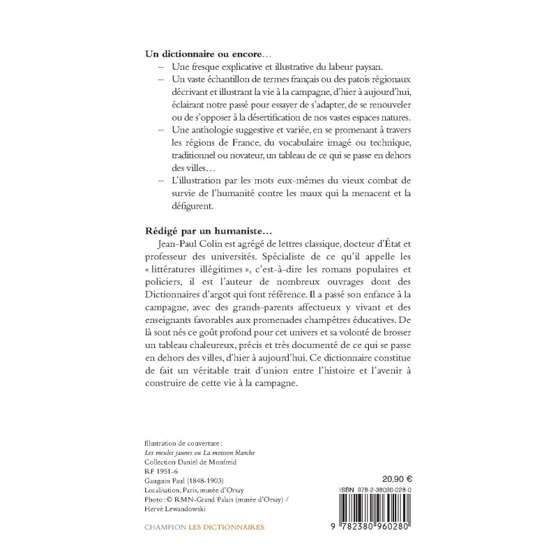 Jean-Paul Colin est agrégé de lettres classique, docteur d’État et professeur des universités. Spécialiste de ce qu’il appelle les « littératures illégitimes », c’est-à-dire les romans populaires et policiers, il est l’auteur de nombreux ouvrages dont des Dictionnaires d’argot qui font référence. Il a passé son enfance à la campagne, avec des grands-parents affectueux y vivant et des enseignants favorables aux promenades champêtres éducatives. De là sont nés ce goût profond pour cet univers et sa volonté de brosser un tableau chaleureux, précis et très documenté de ce qui se passe en dehors des villes, d’hier à aujourd’hui. Ce dictionnaire constitue de fait un véritable trait d’union entre l’histoire et l’avenir à construire de cette vie à la campagne.