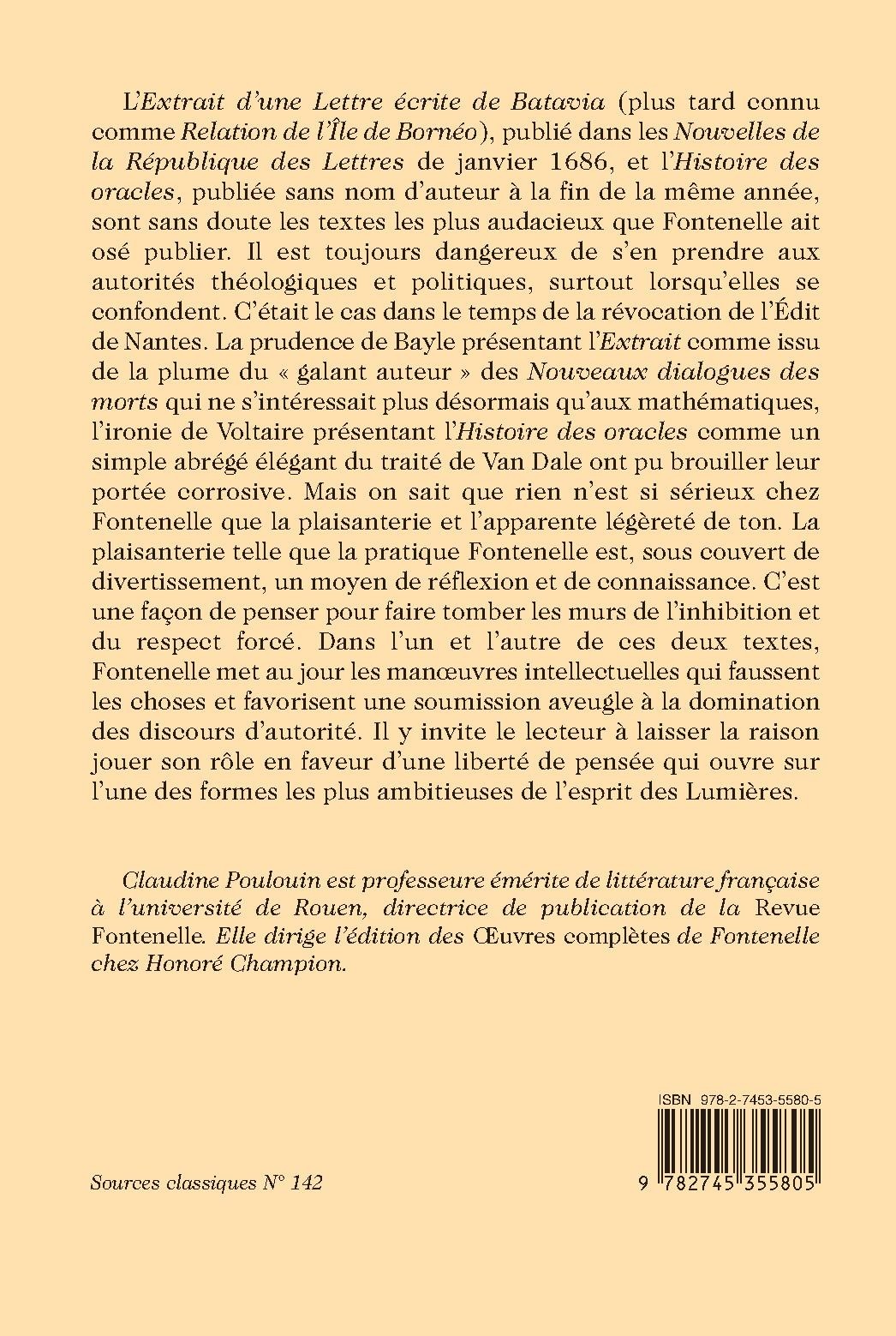 L’Extrait d’une Lettre écrite de Batavia (plus tard connu comme Relation de l’Île de Bornéo), publié dans les Nouvelles de la République des Lettres de janvier 1686, et l’Histoire des oracles, publiée sans nom d’auteur à la fin de la même année, sont sans doute les textes les plus audacieux que Fontenelle ait osé publier. Il est toujours dangereux de s’en prendre aux autorités théologiques et politiques, surtout lorsqu’elles se confondent. C’était le cas dans le temps de la révocation de l’Édit de Nantes. La prudence de Bayle présentant l’Extrait comme issu de la plume du « galant auteur » des Nouveaux dialogues des morts qui ne s’intéressait plus désormais qu’aux mathématiques, l’ironie de Voltaire présentant l’Histoire des oracles comme un simple abrégé élégant du traité de Van Dale ont pu brouiller leur portée corrosive. Mais on sait que rien n’est si sérieux chez Fontenelle que la plaisanterie et l’apparente légèreté de ton. La plaisanterie telle que la pratique Fontenelle est, sous couvert de divertissement, un moyen de réflexion et de connaissance. C’est une façon de penser pour faire tomber les murs de l’inhibition et du respect forcé. Dans l’un et l’autre de ces deux textes, Fontenelle met au jour les manœuvres intellectuelles qui faussent les choses et favorisent une soumission aveugle à la domination des discours d’autorité. Il y invite le lecteur à laisser la raison jouer son rôle en faveur d’une liberté de pensée qui ouvre sur l’une des formes les plus ambitieuses de l’esprit des Lumières.