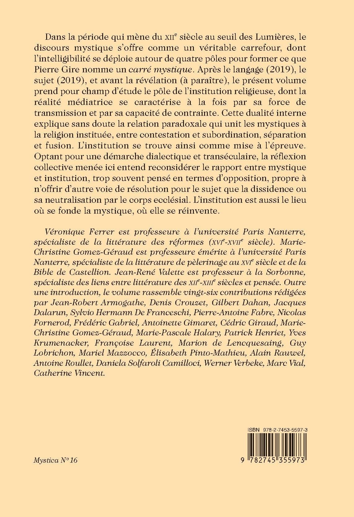 Dans la période qui mène du XIIe siècle au seuil des Lumières, le discours mystique s’offre comme un véritable carrefour, dont l’intelligibilité se déploie autour de quatre pôles pour former ce que Pierre Gire nomme un carré mystique. Après le langage (2019), le sujet (2019), et avant la révélation (à paraître), le présent volume prend pour champ d’étude le pôle de l’institution religieuse, dont la réalité médiatrice se caractérise à la fois par sa force de transmission et par sa capacité de contrainte. Cette dualité interne explique sans doute la relation paradoxale qui unit les mystiques à la religion instituée, entre contestation et subordination, séparation et fusion. L’institution se trouve ainsi comme mise à l’épreuve. Optant pour une démarche dialectique et transéculaire, la réflexion collective menée ici entend reconsidérer le rapport entre mystique et institution, trop souvent pensé en termes d’opposition, propre à n’offrir d’autre voie de résolution pour le sujet que la dissidence ou sa neutralisation par le corps ecclésial. L’institution est aussi le lieu où se fonde la mystique, où elle se réinvente.