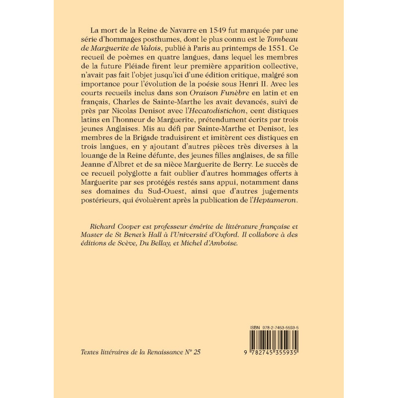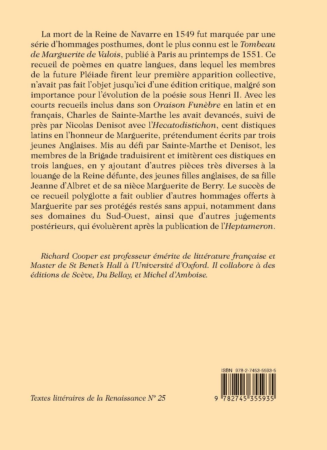 La mort de la Reine de Navarre en 1549 fut marquée par une série d’hommages posthumes, dont le plus connu est le Tombeau de Marguerite de Valois, publié à Paris au printemps de 1551. Ce recueil de poèmes en quatre langues, dans lequel les membres de la future Pléiade firent leur première apparition collective, n’avait pas fait l’objet jusqu’ici d’une édition critique, malgré son importance pour l’évolution de la poésie sous Henri II. Avec les courts recueils inclus dans son Oraison Funèbre en latin et en français, Charles de Sainte-Marthe les avait devancés, suivi de près par Nicolas Denisot avec l’Hecatodistichon, cent distiques latins en l’honneur de Marguerite, prétendument écrits par trois jeunes Anglaises. Mis au défi par Sainte-Marthe et Denisot, les membres de la Brigade traduisirent et imitèrent ces distiques en trois langues, en y ajoutant d’autres pièces très diverses à la louange de la Reine défunte, des jeunes filles anglaises, de sa fille Jeanne d’Albret et de sa nièce Marguerite de Berry. Le succès de ce recueil polyglotte a fait oublier d’autres hommages offerts à Marguerite par ses protégés restés sans appui, notamment dans ses domaines du Sud-Ouest, ainsi que d’autres jugements postérieurs, qui évoluèrent après la publication de l’Heptameron.