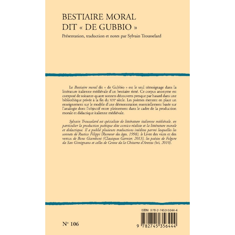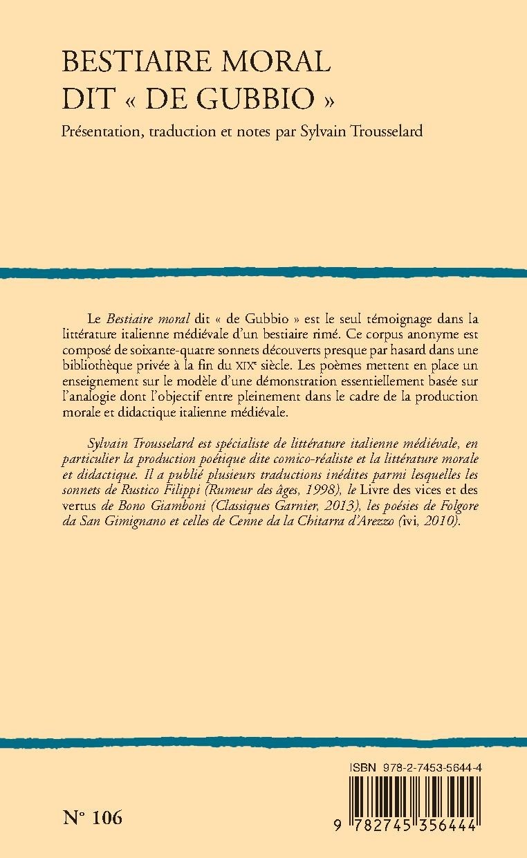 Le Bestiaire moral dit « de Gubbio » est le seul témoignage dans la littérature italienne médiévale d’un bestiaire rimé. Ce corpus anonyme est composé de soixante-quatre sonnets découverts presque par hasard dans une bibliothèque privée à la fin du XIXe siècle. Les poèmes mettent en place un enseignement sur le modèle d’une démonstration essentiellement basée sur l’analogie dont l’objectif entre pleinement dans le cadre de la production morale et didactique italienne médiévale.