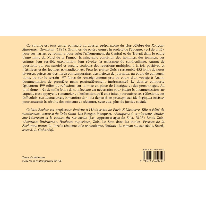 Ce volume est tout entier consacré au dossier préparatoire du plus célèbre des Rougon-Macquart, Germinal (1885). Grand cri de colère contre la société de l’époque, « cri de pitié » pour ses parias, ce roman a pour sujet l’affrontement du Capital et du Travail dans le cadre d’une mine du Nord de la France, la misérable condition des hommes, des femmes, des enfants, leur terrible exploitation, leur révolte, la naissance du syndicalisme. Autant de questions qui ont suscité et suscitent toujours des réactions multiples, à la fois positives et négatives, et des lectures contradictoires. Pour les traiter, Zola a rassemblé 453 folios de notes diverses, prises sur des livres contemporains, des articles de journaux, au cours de conversations, ou sur le terrain: 97 folios de renseignements pris au cours d’un voyage à Anzin, documentation de première main particulièrement intéressante! Le dossier comporte également 499 folios de réflexions sur la mise en place de l’intrigue et des personnages. Au total donc, près de mille folios dont la lecture est nécessaire pour jauger la documentation sur laquelle s’est appuyé le romancier et l’utilisation qu’il en a faite, pour suivre ses réflexions, ses difficultés, ses découvertes, la manière dont il a dépassé ses présupposés idéologiques initiaux pour soutenir la révolte des mineurs et réclamer, avec eux, plus de justice sociale.