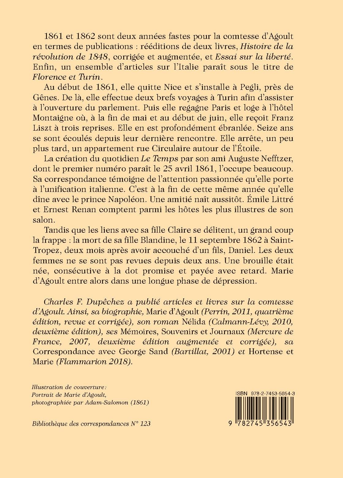 1861 et 1862 sont deux années fastes pour la comtesse d’Agoult en termes de publications : rééditions de deux livres, Histoire de la révolution de 1848, corrigée et augmentée, et Essai sur la liberté. Enfin, un ensemble d’articles sur l’Italie paraît sous le titre de Florence et Turin.