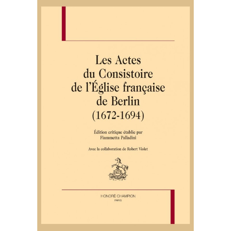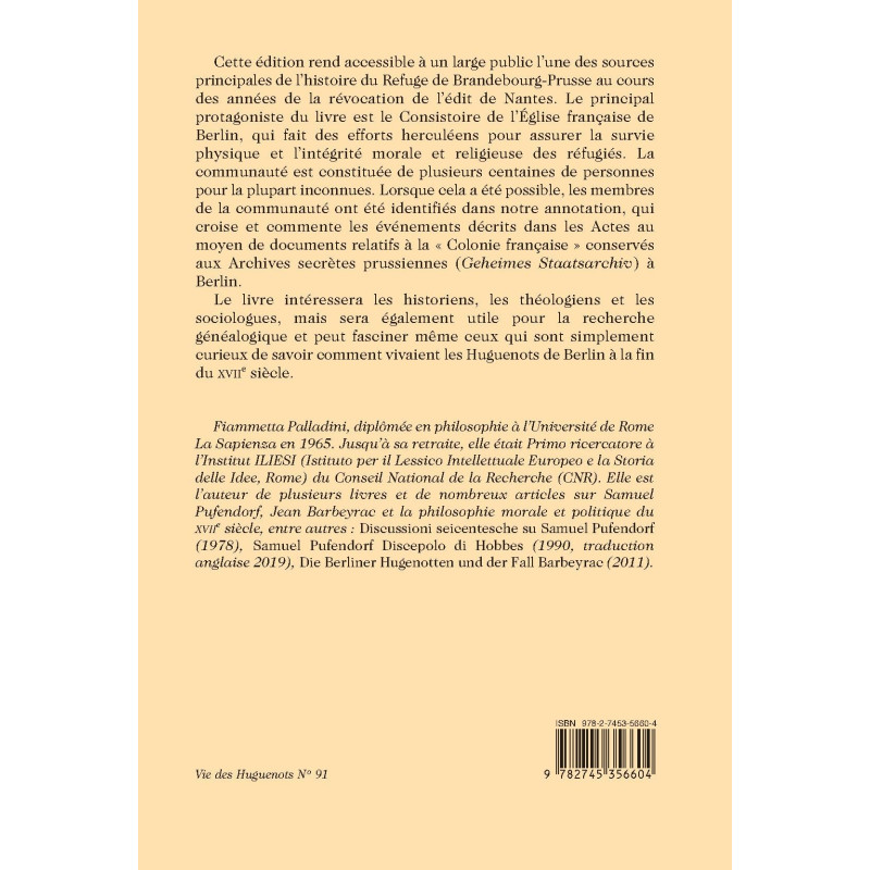 Cette édition rend accessible à un large public l’une des sources principales de l’histoire du Refuge de Brandebourg-Prusse au cours des années de la révocation de l’édit de Nantes. Le principal protagoniste du livre est le Consistoire de l’Église française de Berlin, qui fait des efforts herculéens pour assurer la survie physique et l’intégrité morale et religieuse des réfugiés. La communauté est constituée de plusieurs centaines de personnes pour la plupart inconnues. Lorsque cela a été possible, les membres de la communauté ont été identifiés dans notre annotation, qui croise et commente les événements décrits dans les Actes au moyen de documents relatifs à la « Colonie française » conservés aux Archives secrètes prussiennes (Geheimes Staatsarchiv) à Berlin.