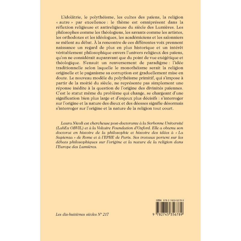 L’idolâtrie, le polythéisme, les cultes des païens, la religion « autre » par excellence : le thème est omniprésent dans la réflexion religieuse et antireligieuse du siècle des Lumières. Les philosophes comme les théologiens, les savants comme les artistes, les orthodoxes et les idéologues, les académiciens et les salonniers se mêlent au débat. À la rencontre de ces différentes voix prennent naissance un regard de plus en plus historique et un intérêt véritablement philosophique envers l’univers religieux des païens, qu’on ne considérait auparavant que du point de vue exégétique et théologique. S’ensuit un renversement de paradigme : l’idée traditionnelle selon laquelle le monothéisme serait la religionoriginelle et le paganisme sa corruption est graduellement mise en doute. Le nouveau modèle du polythéisme primitif, qui s’impose àpartir de la moitié du siècle, ne représente pas simplement une réponse inédite à la question de l’origine des divinités païennes. C’est le statut même du problème qui change, se chargeant d’une signification bien plus large et d’enjeux plus décisifs : s’interroger sur l’origine et la nature des dieux et des déesses signifie désormais s’interroger sur l’origine et la nature de la religion tout court.