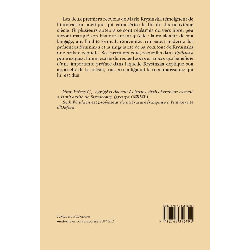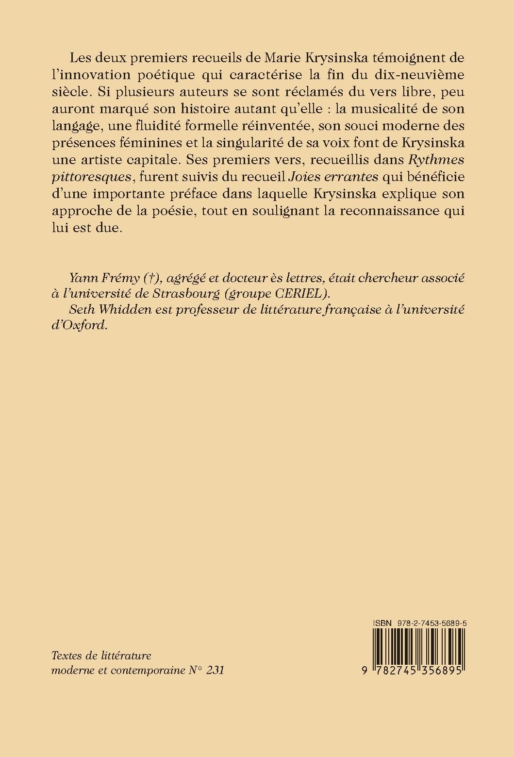 Les deux premiers recueils de Marie Krysinska témoignent de l’innovation poétique qui caractérise la fin du dix-neuvième siècle. Si plusieurs auteurs se sont réclamés du vers libre, peu auront marqué son histoire autant qu’elle : la musicalité de son langage, une fluidité formelle réinventée, son souci moderne des présences féminines et la singularité de sa voix font de Krysinska une artiste capitale. Ses premiers vers, recueillis dans Rythmes pittoresques, furent suivis du recueil Joies errantes qui bénéficie d’une importante préface dans laquelle Krysinska explique son approche de la poésie, tout en soulignant la reconnaissance qui lui est due.